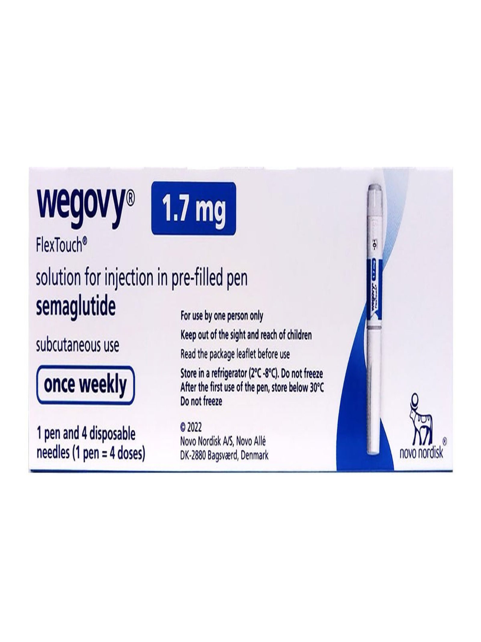 Wegovy 1.7 mg pen is a medicine that aids in weight loss and maintenance for overweight or obese adults. It also helps lower the risk of heart-related events like heart attacks and strokes in adults with heart disease who are obese or overweight. It works best with a low-calorie diet and exercise.